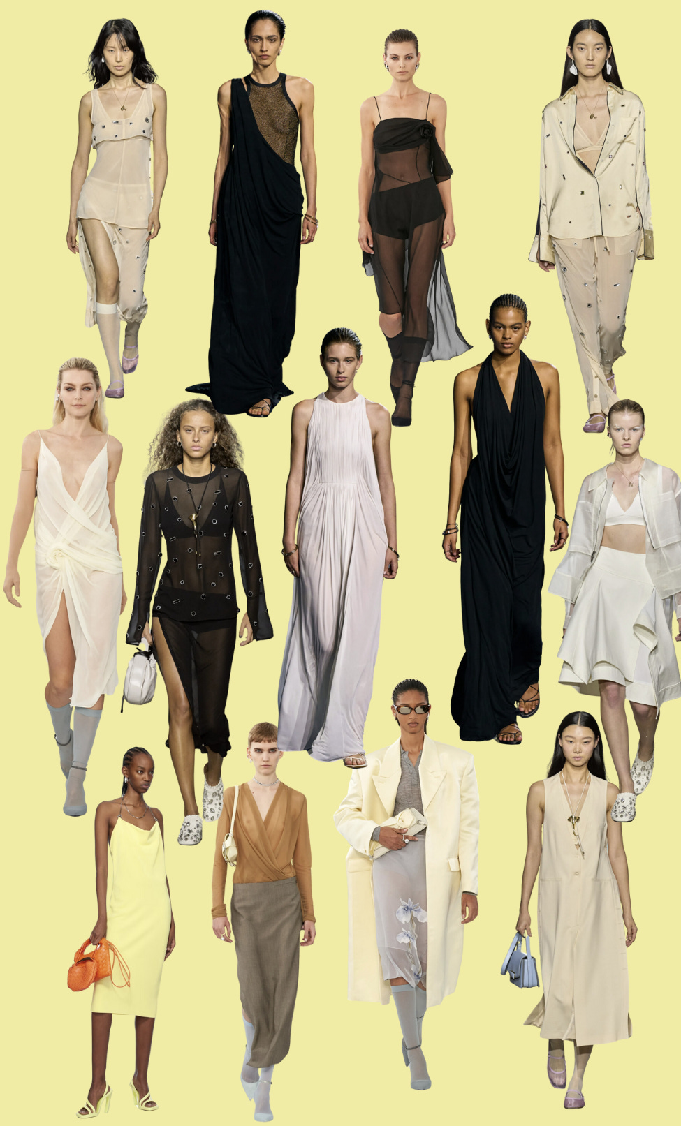 Sheer Fabrics: Reached new heights of popularity, embraced by designers like Casey Cadwaller at Mugler, symbolizing women's empowerment and celebrating diverse body types.